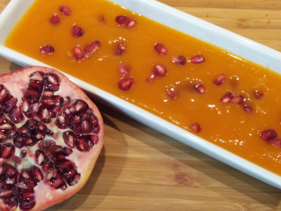 Entonces templaremos en el horno a 50ºC con la puerta abierta. Decoramos con la granada, y es la versión crudivegana de la opción de crema de calabaza