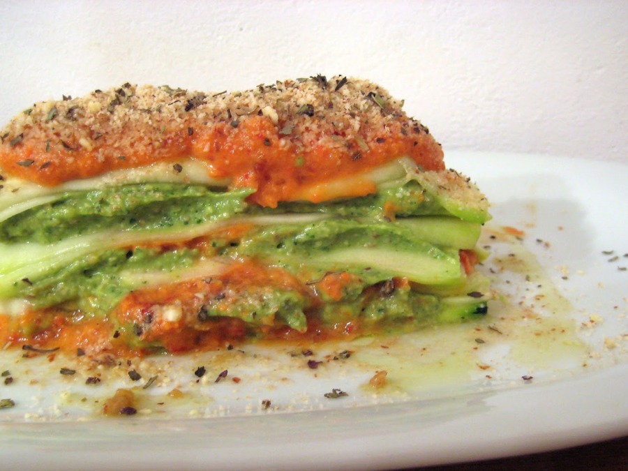 MONTAREMOS NUESTRA LASAÑA PONIENDO CAPAS ALTERNAS DE CALABACIN (NUESTRA PASTA DE LASAÑA) QUESO, PESTO Y CHAMPIÑONES. PARA DECORAR PODEMOS UTILIZAR ALBAHACA FINAMENTE